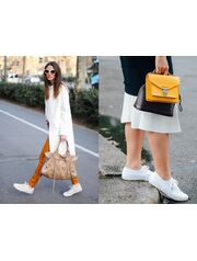 Однако чтобы выглядеть действительно хорошо, нужно выбрать, с какой сумкой вы будете носить белые кроссовки. Подчеркнуть их свежесть можно, выбрав изделие с одинаковыми белыми акцентами, но не однотонное. Например, с темно-синими и белыми полосами.