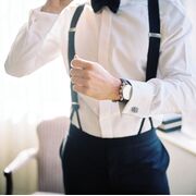 - Подтяжки — это очень хорошая альтернатива ремню. Они удобны тем, что прекрасно поддерживают брюки, не передавливая живот, не ограничивают движений и не создают дискомфорта. Классические подтяжки средней ширины и темных тонов с минималистичными узорами (горошек, полоски или цветы) и патриотическими мотивами дизайнеры рекомендуют для свадеб в стиле 1920-х годов. Они шикарно выглядят с белым костюмом и легкими черно-белыми мокасинами.